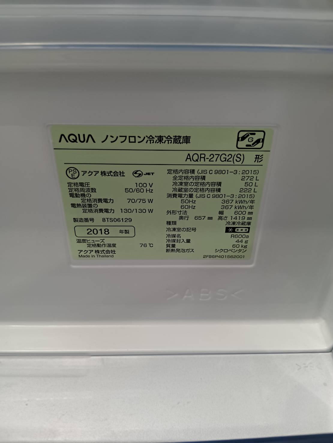 AQUA2018年製272L冷蔵庫 AQR-27G2(S)