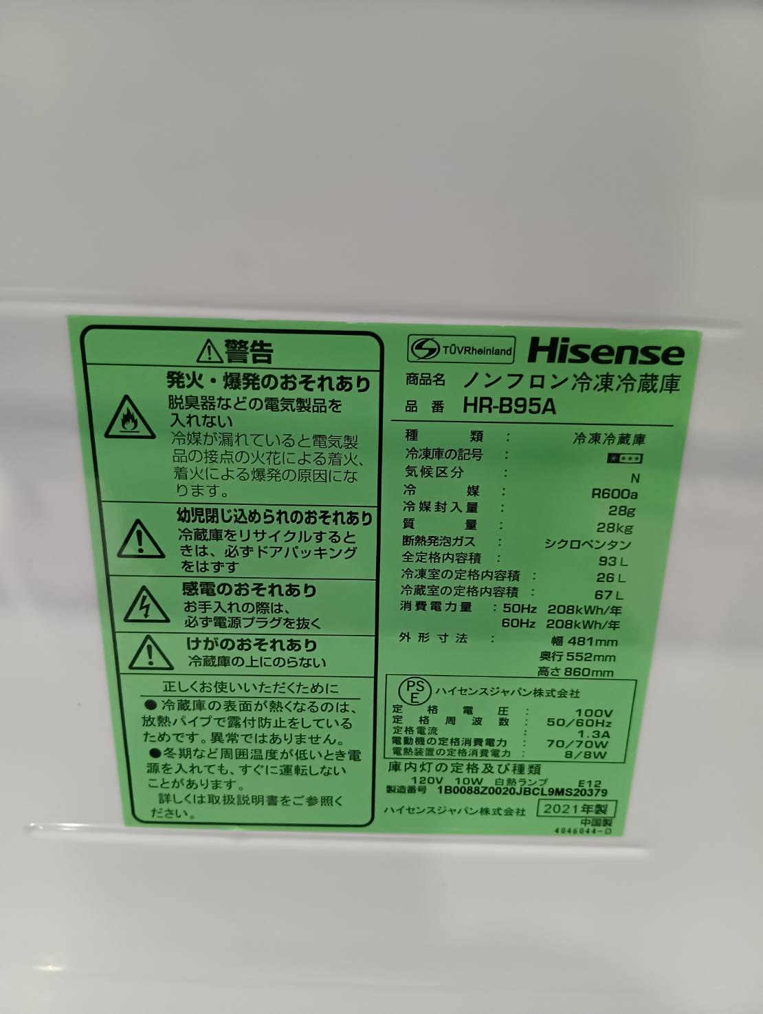 Hisense2021年製93L冷蔵庫 HR-B95A