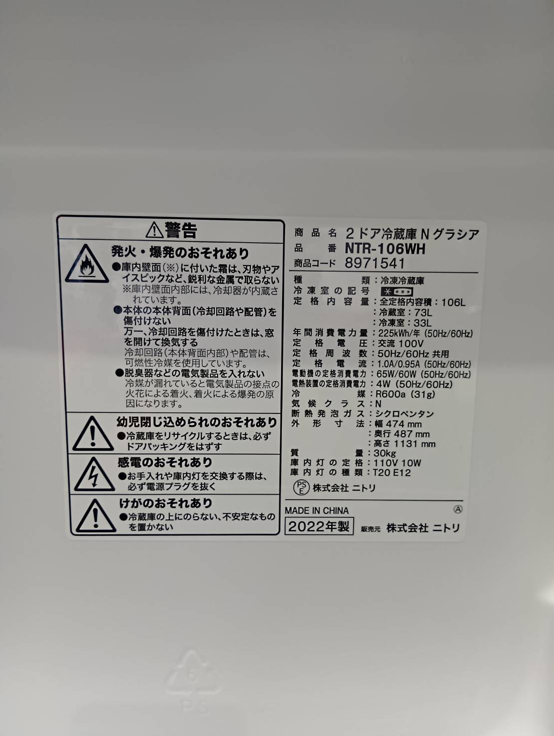 ニトリ2022年製106L冷蔵庫 NTR-106WH