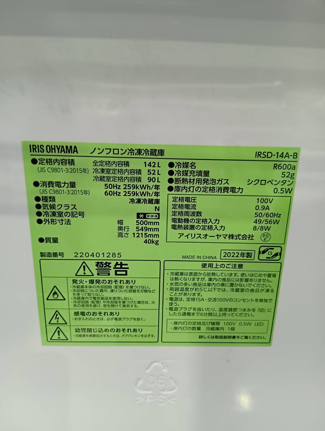 IRIS OHYAMA2022年製142L冷蔵庫 IRSD-14A-B