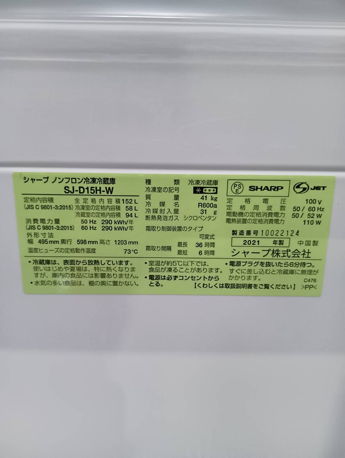 SHARP2021年製152L冷蔵庫