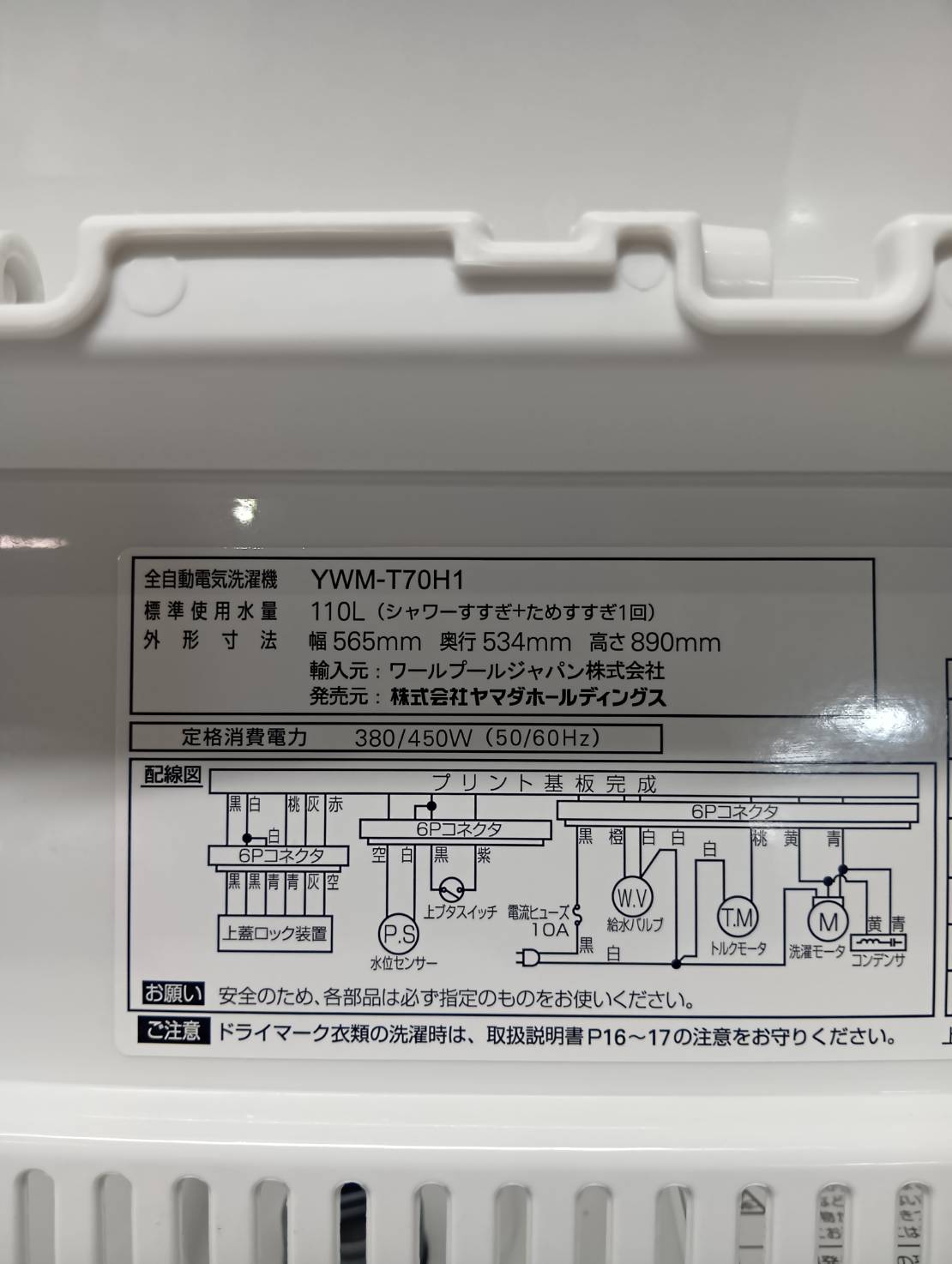 YAMADA2023年製7.0Kg洗濯機 YWM-T70H1