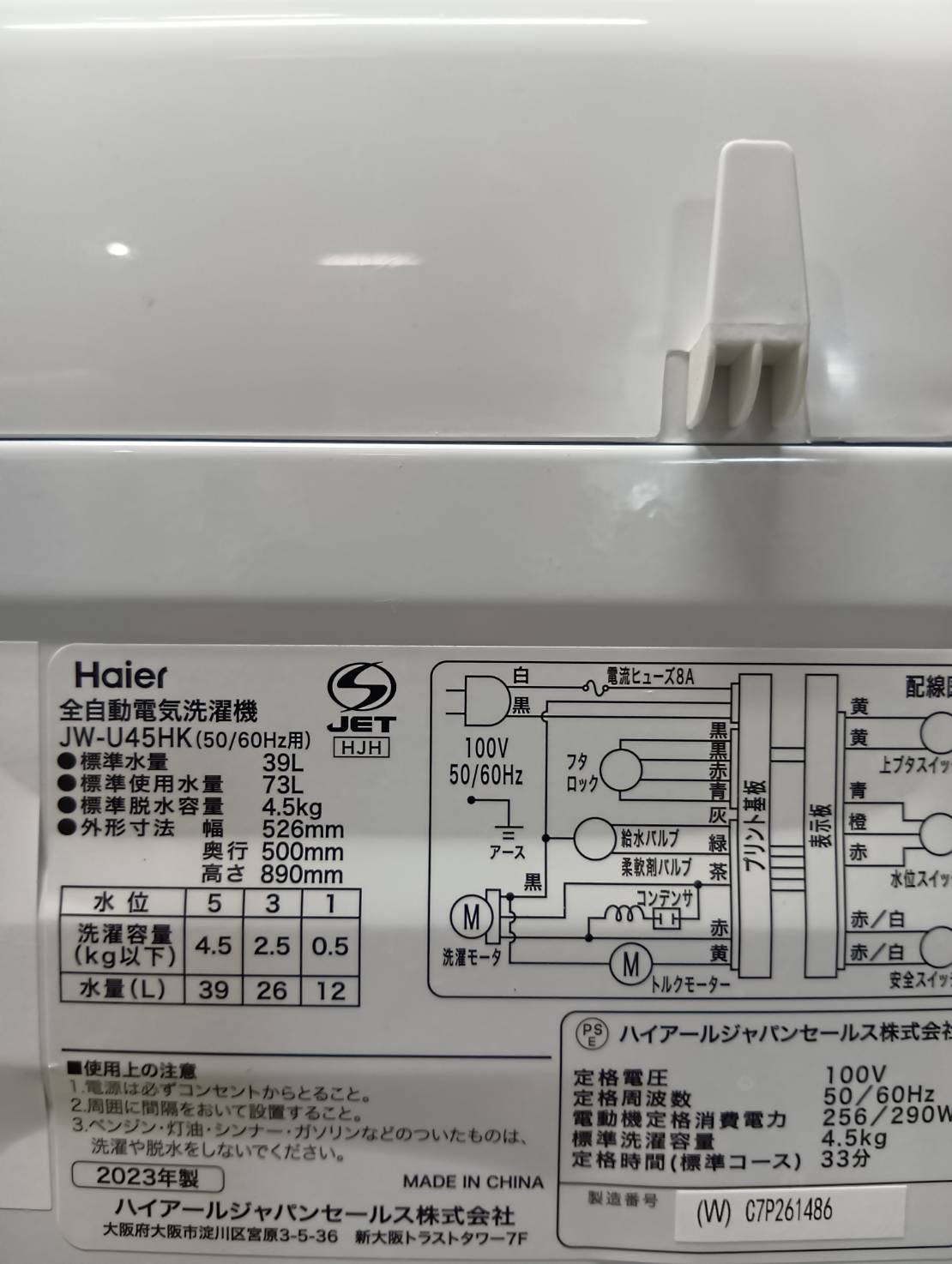 Haier2023年製4.5Kg洗濯機 JW-U45HK