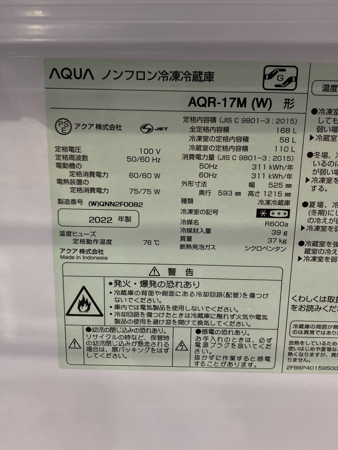 【新生活応援品】AQUA2022年製168L冷蔵庫 AQR-17M