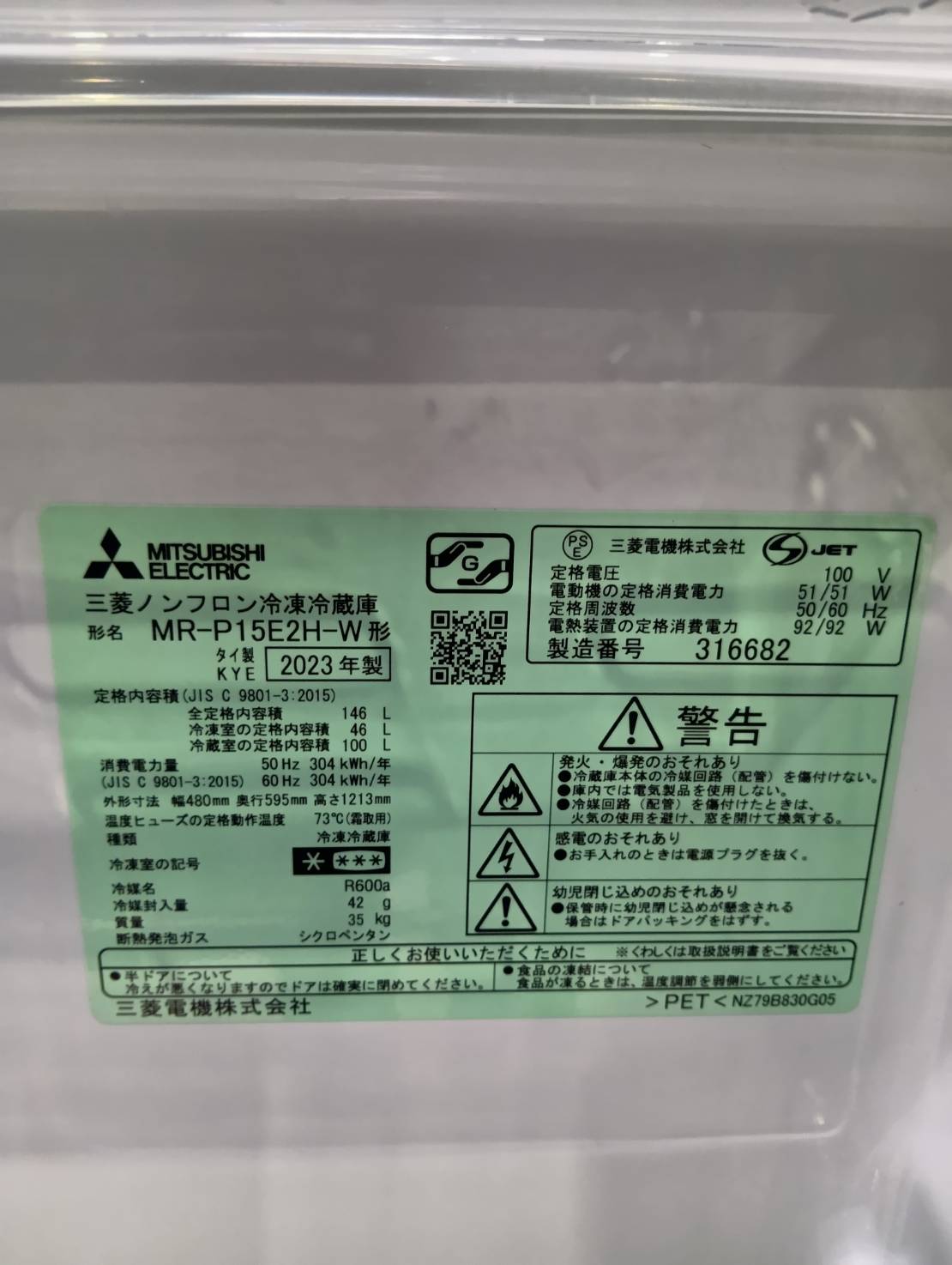 三菱電機2023年製146L冷蔵庫 MR-P15E2H-W