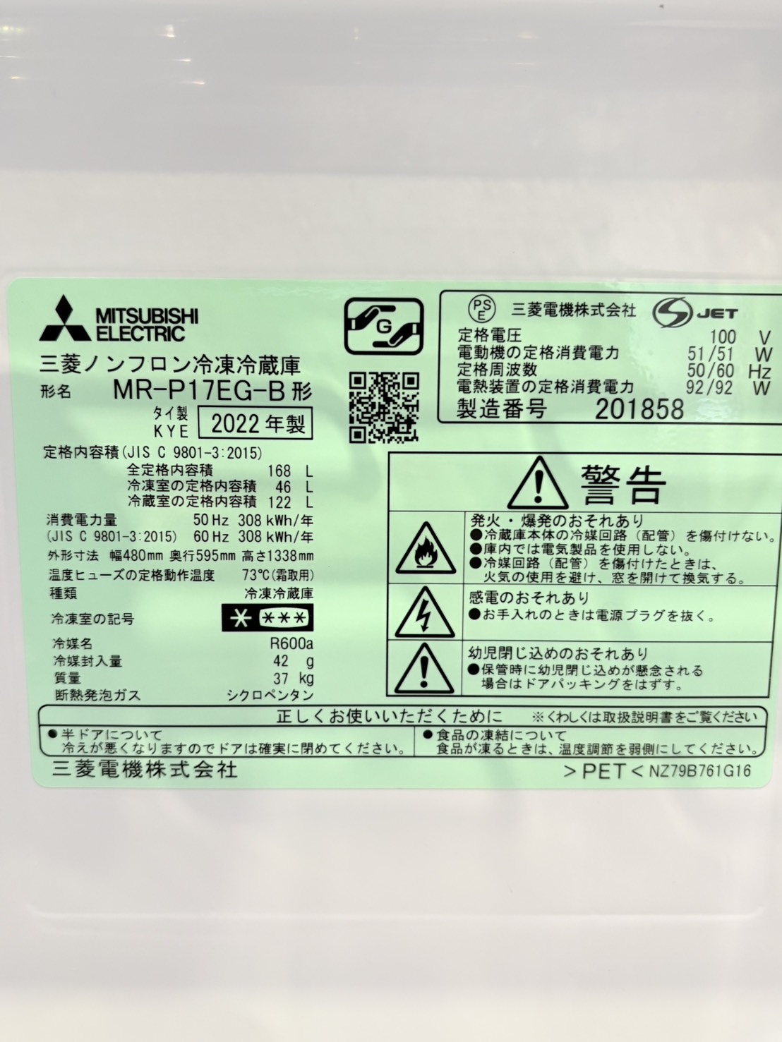 三菱電機2022年製168L冷蔵庫 MR-P17EG-B