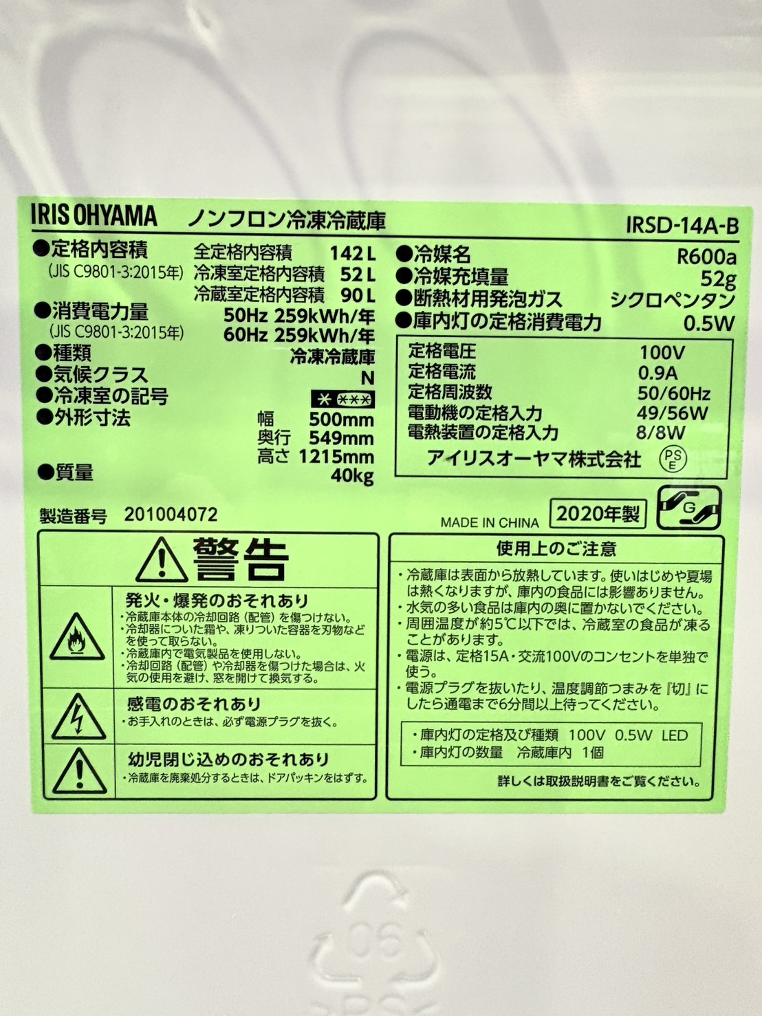 アイリス2020年製142L冷蔵庫 IRSD-14A-B