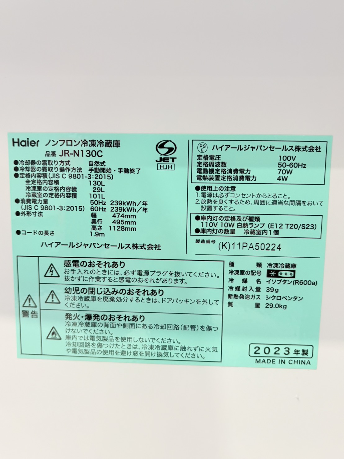 Haier2023年製130L冷蔵庫 JR-N130C