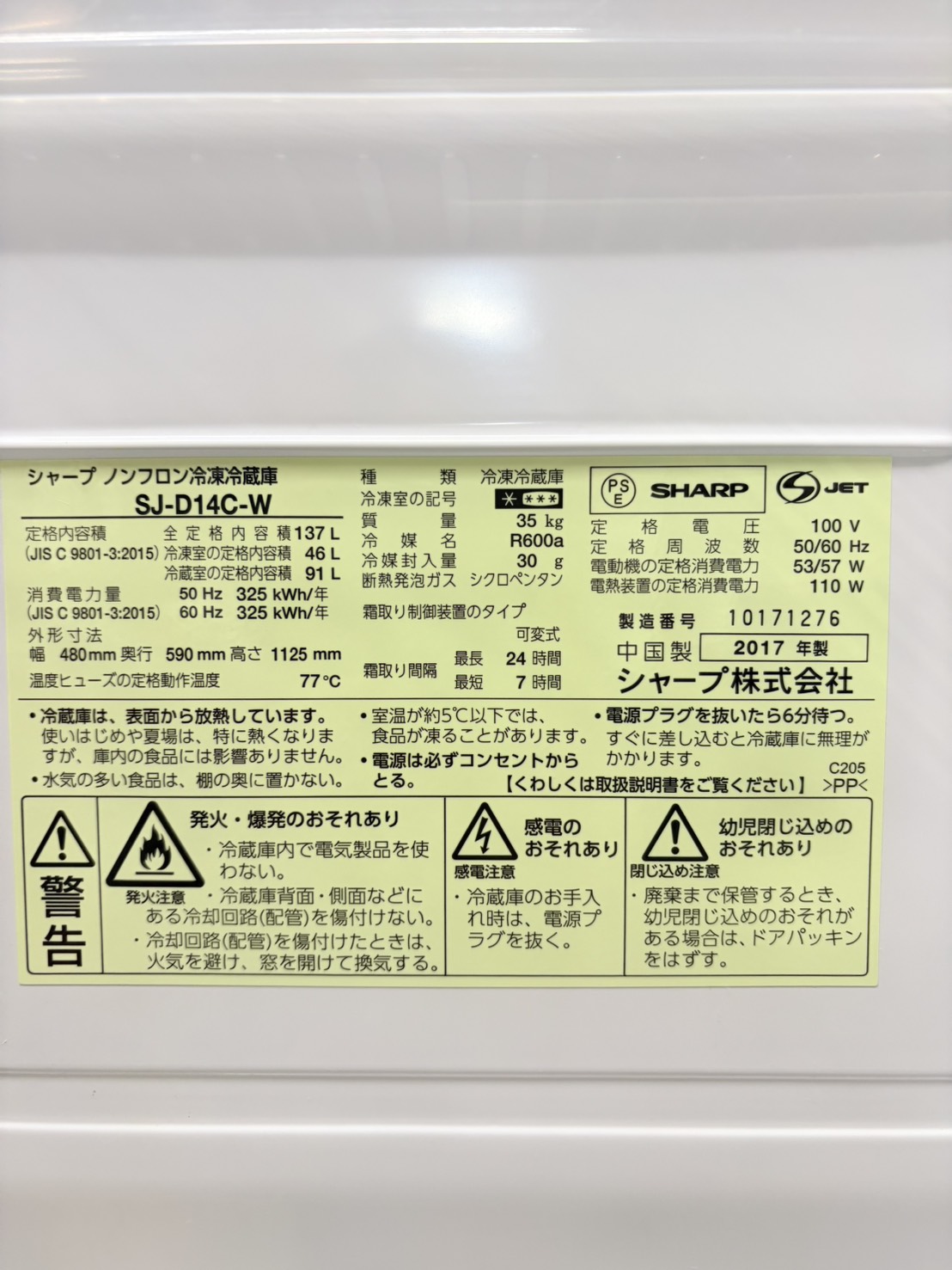 SHARP2017年製137L冷蔵庫 SJ-D14C-W