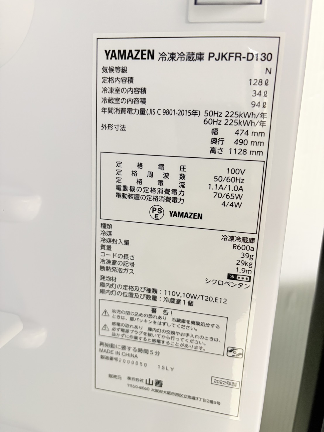 YAMAZEN2022年製128L冷蔵庫 PJKFR-D130
