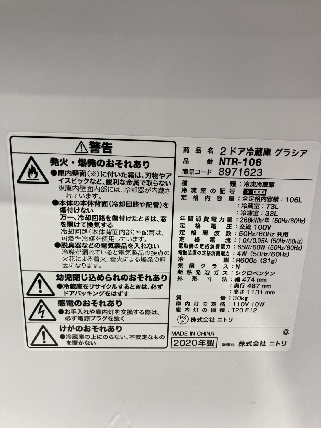 ニトリ2020年製106L冷蔵庫 NTR-106