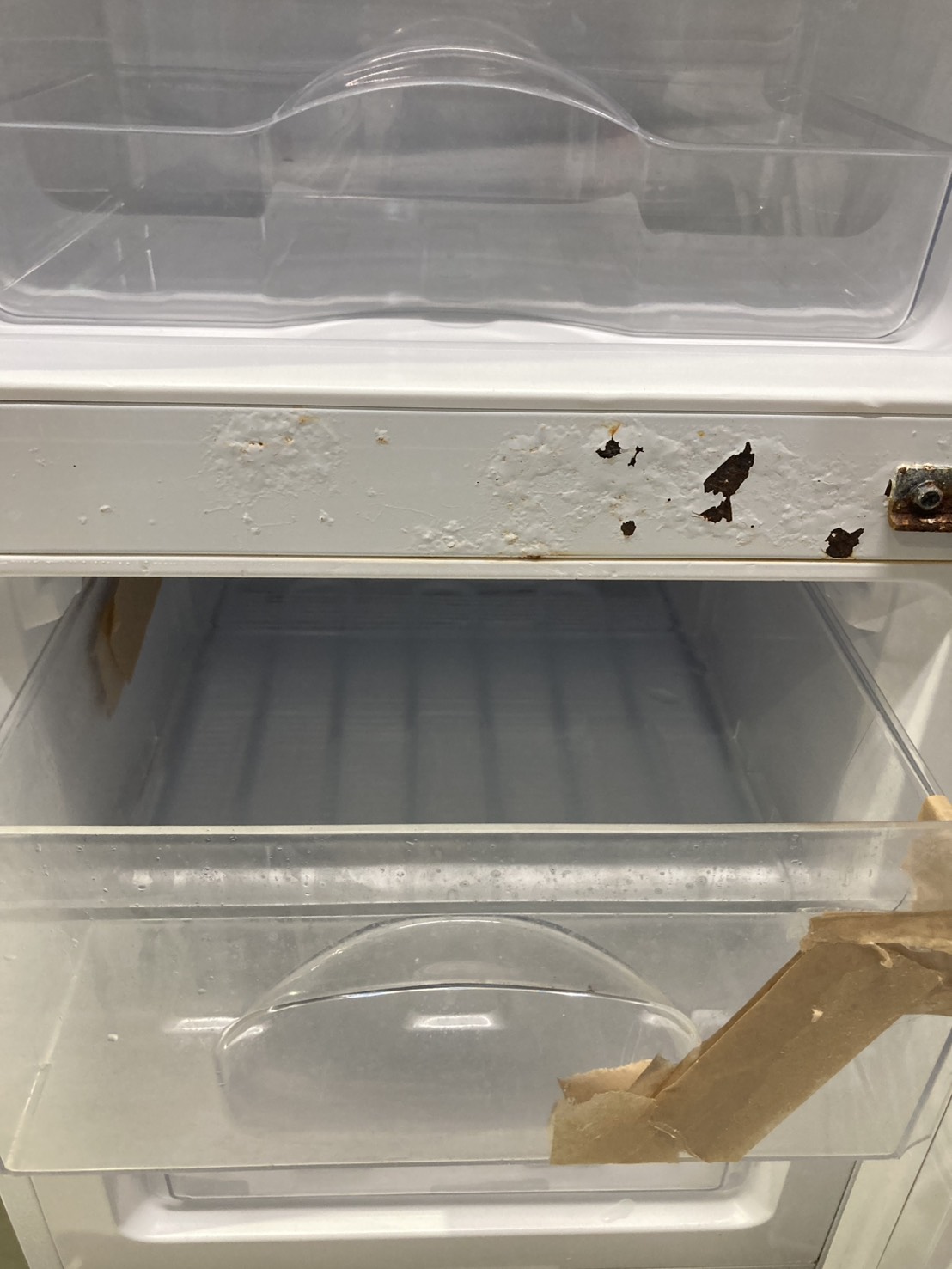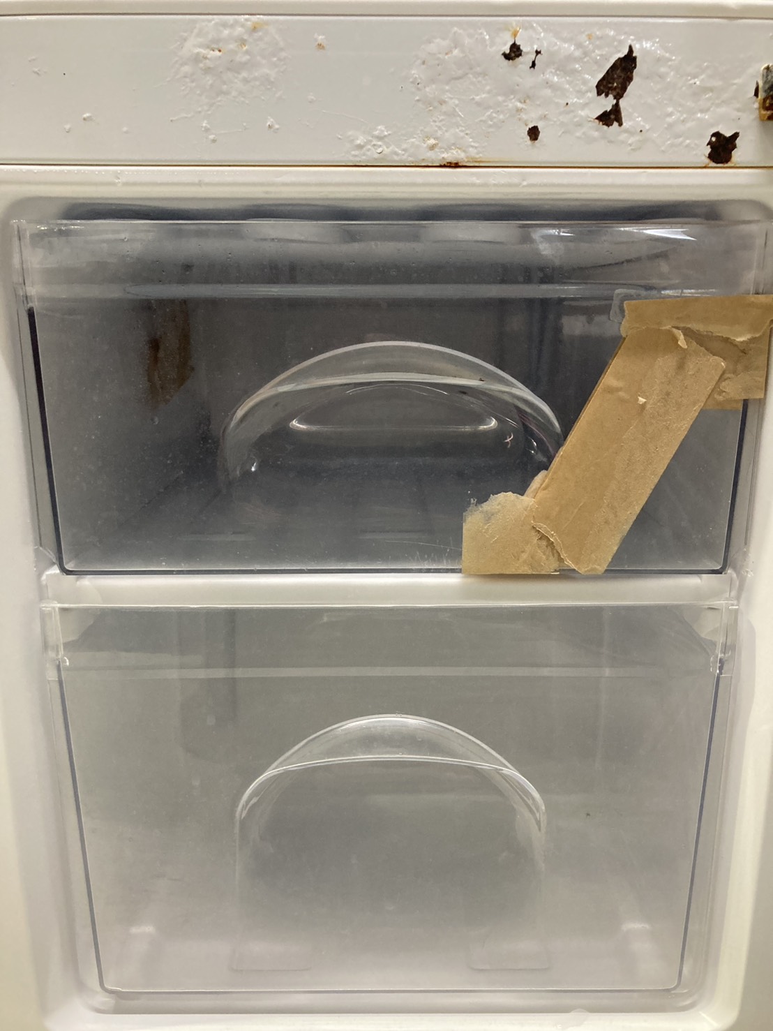 直冷式の2ドア冷蔵庫。冷凍室は2段引き出し収納となっています。霜取り機能は搭載していません。