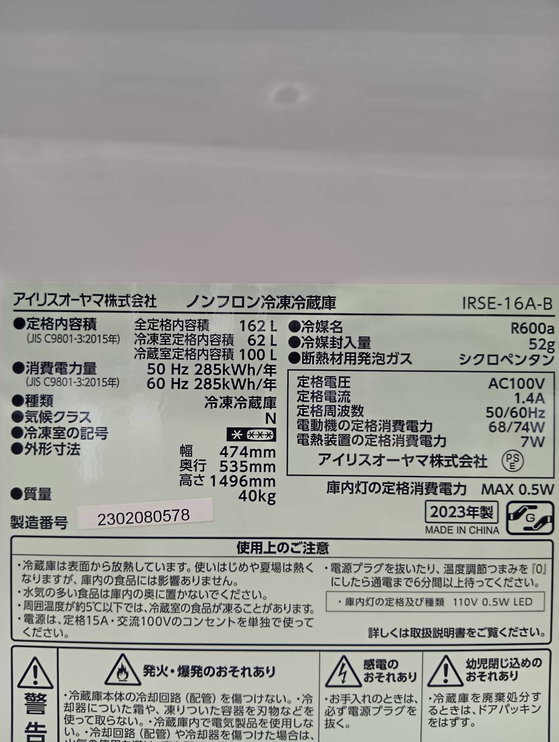 アイリス2023年製162L冷蔵庫