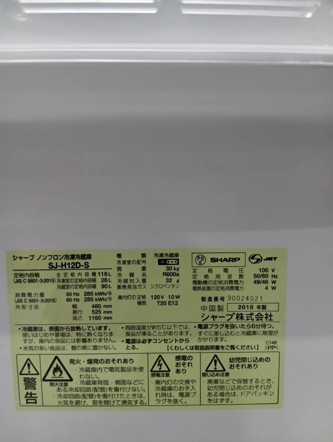 SHARP2018年製118L冷蔵庫 SJ-H12D-S