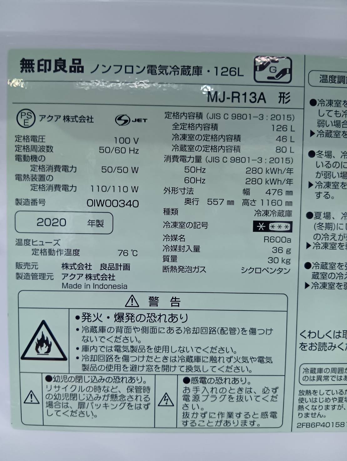 無印良品2020年製126L冷蔵庫 MJ-R13A