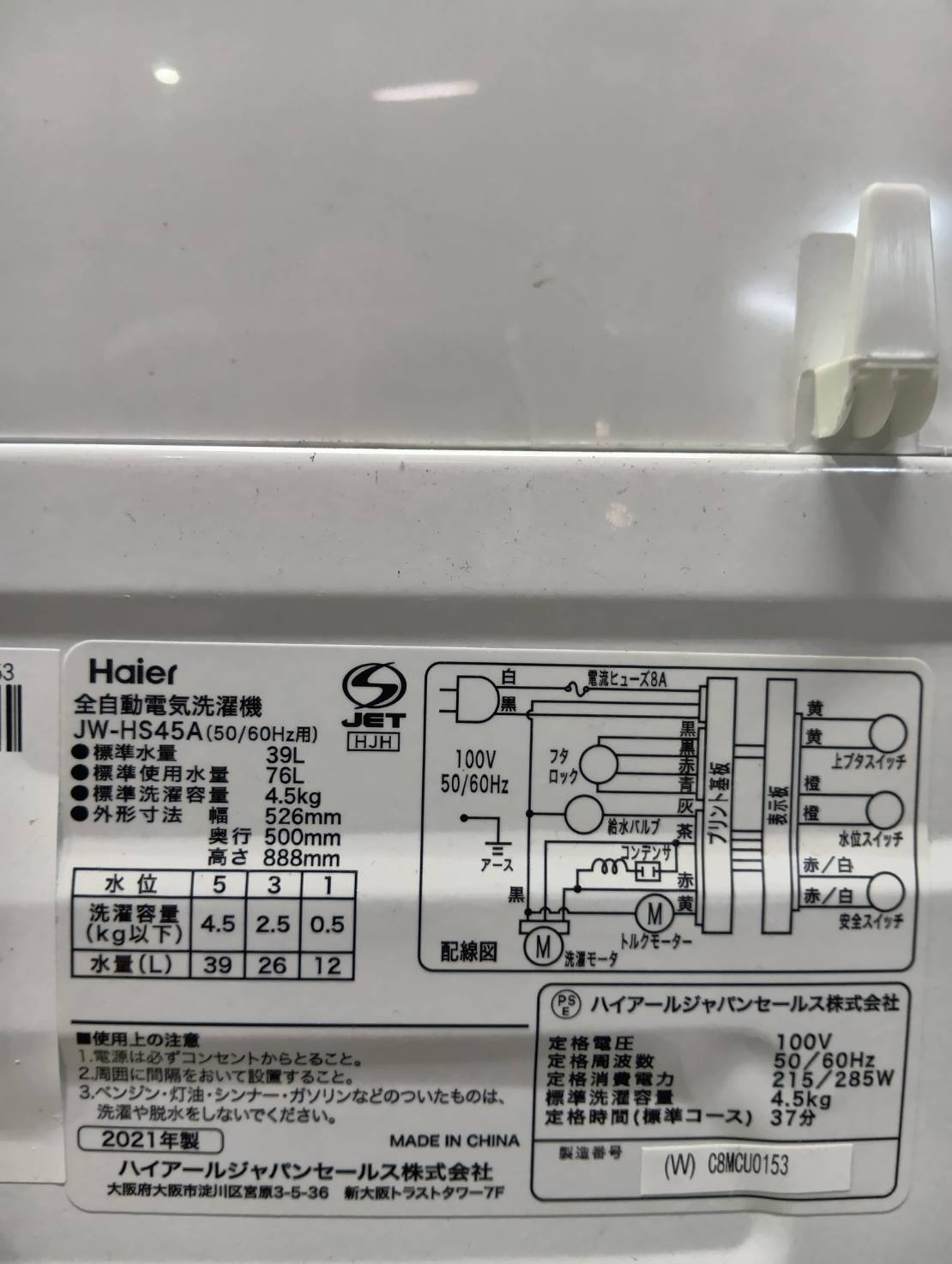 Haier2021年製4.5Kg洗濯機 JW-HS45A