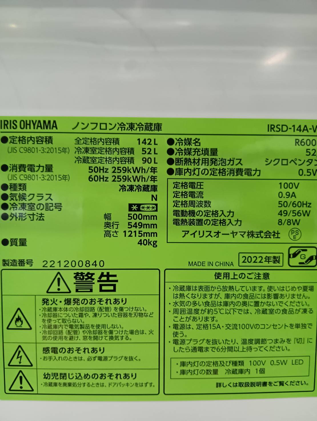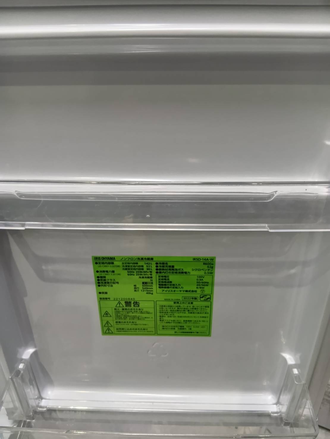 アイリス2022年製142L冷蔵庫